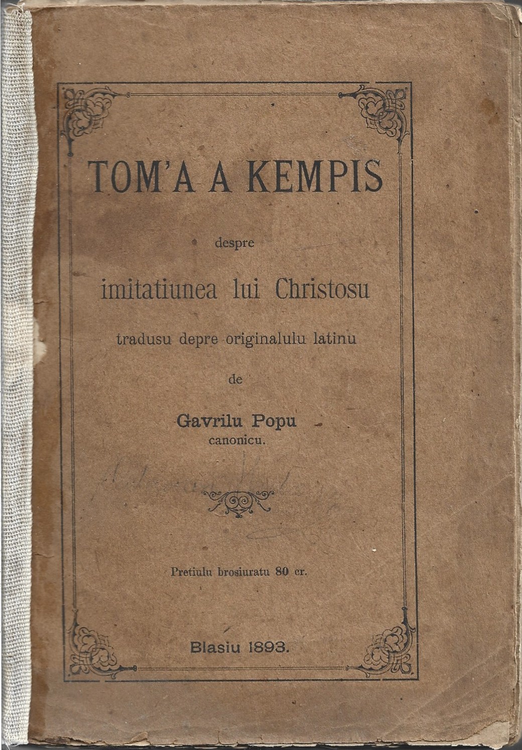 Tom’a a Kempis despre imitatiunea lui Christosu tradusu depre originalulu latinu de Gavrilu Popu canonicu, 1893, Blaj.