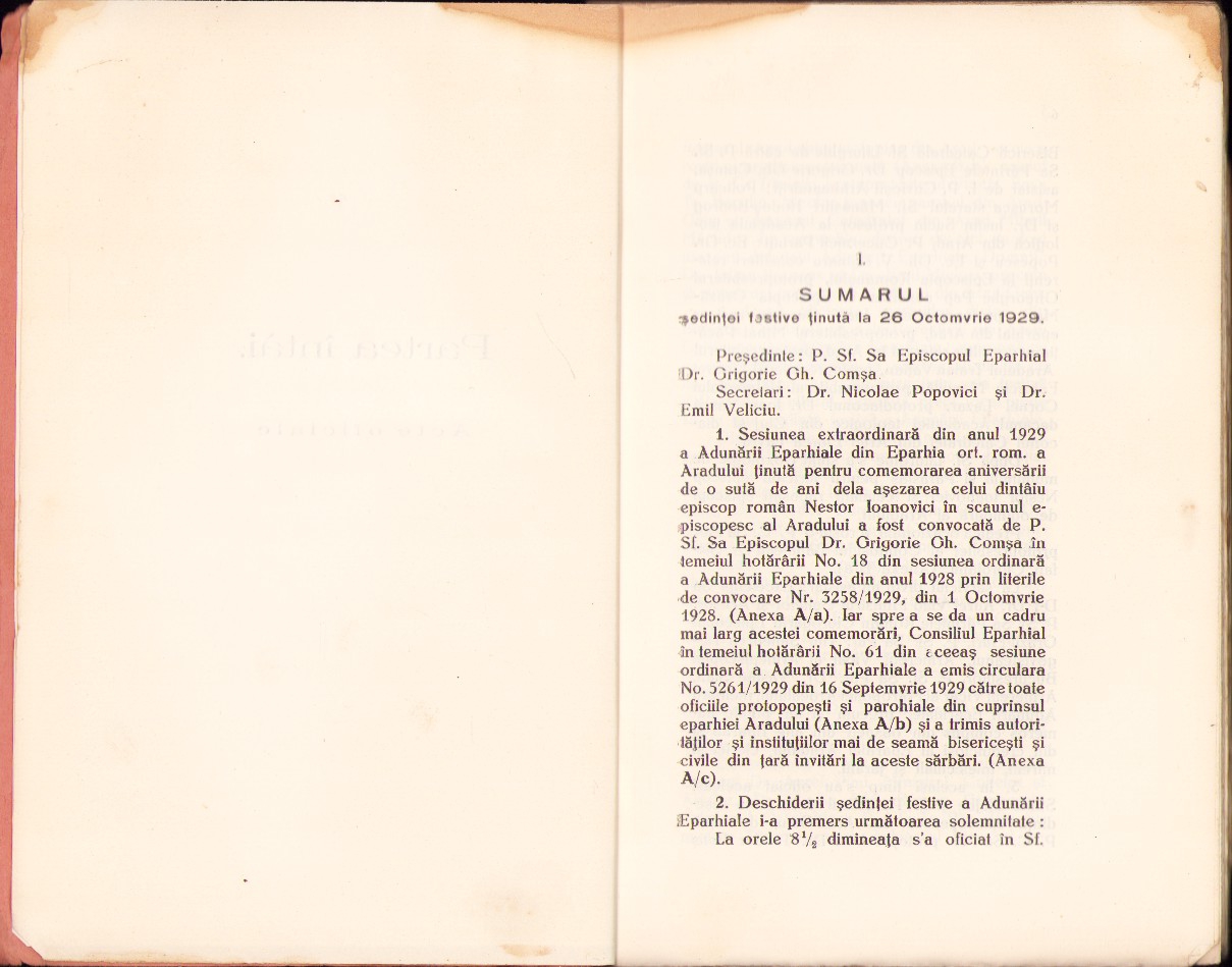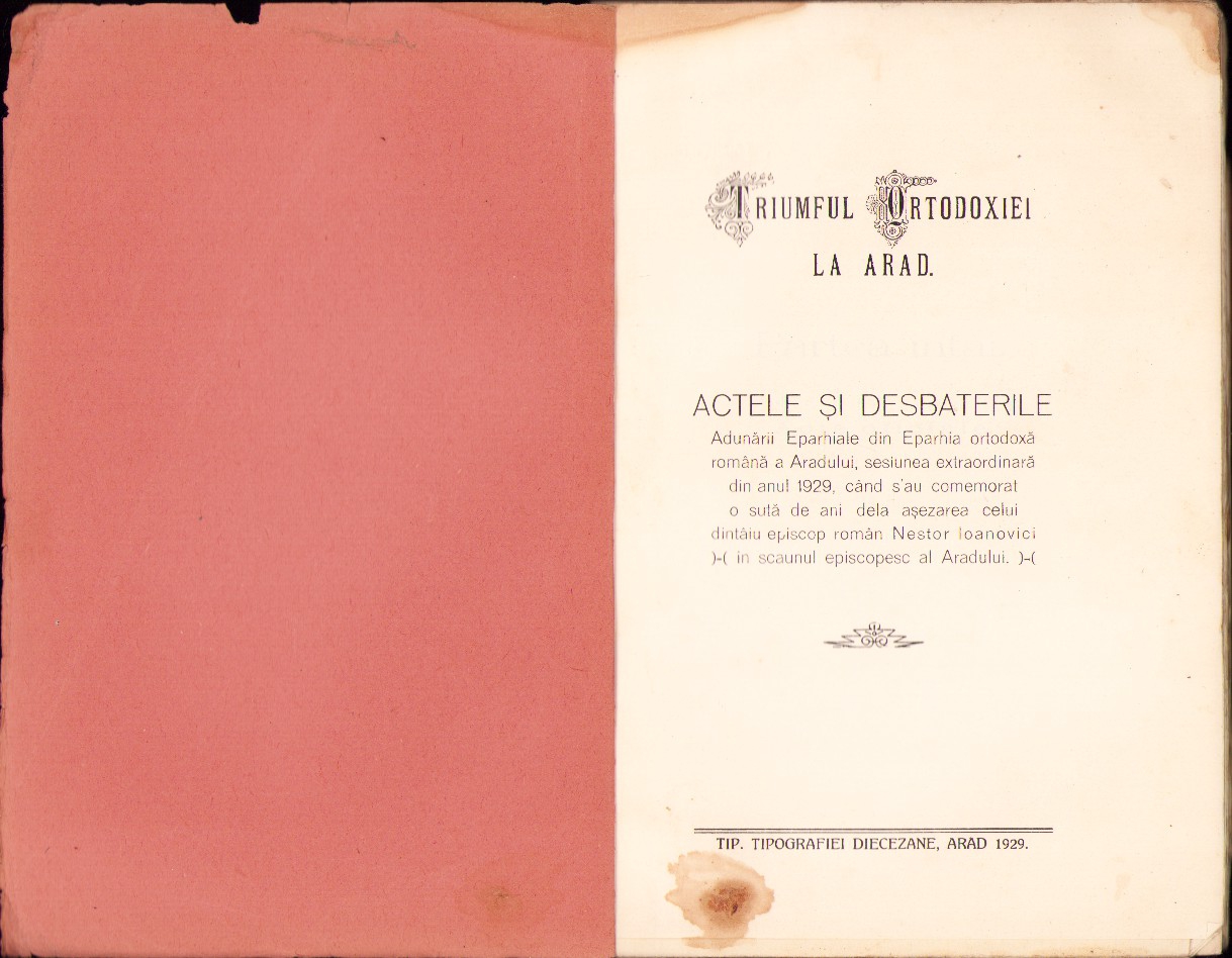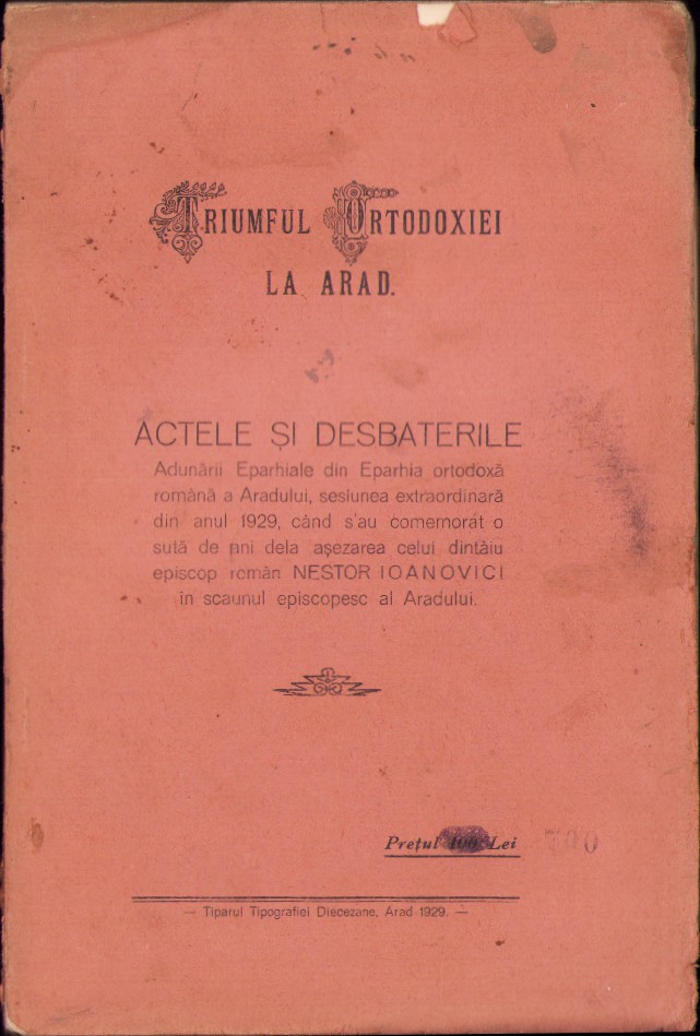 Triumful ortodoxiei la Arad – Actele și desbaterile Adunării Eparhiale din Eparhia ortodoxă română a Aradului, sesiunea extraordinară din anul 1929, când s-au comemorat o sută de ani dela așezarea celui dintâiu episcop român Nestor Ioanovici în scaunul episcopesc al Aradului, 1929, Arad, Tiparul Tipografiei Diecezane