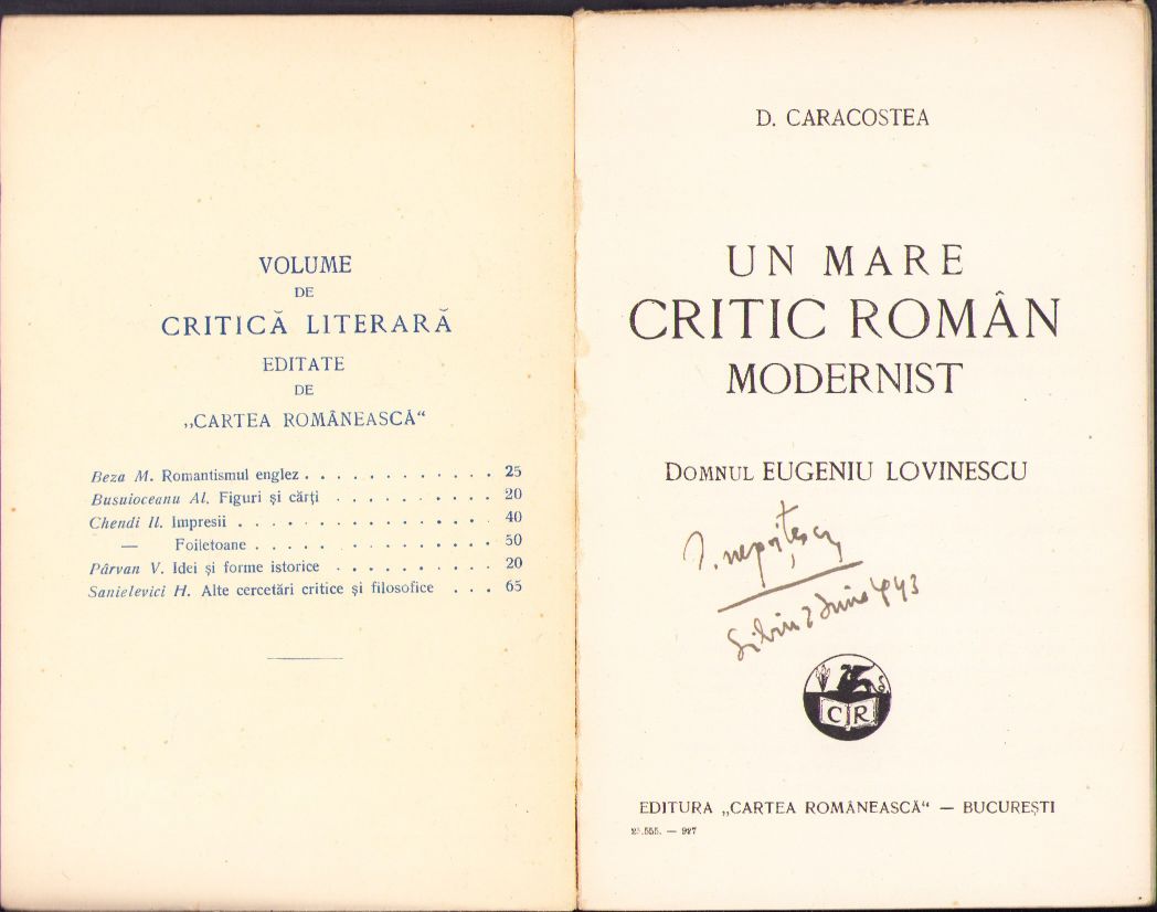 Un mare critic român modernist, domnul Eugeniu Lovinescu de D Caracostea, 1927, cu semnătura olografă a lui Ion Negoițescu, 1943, Sibiu.