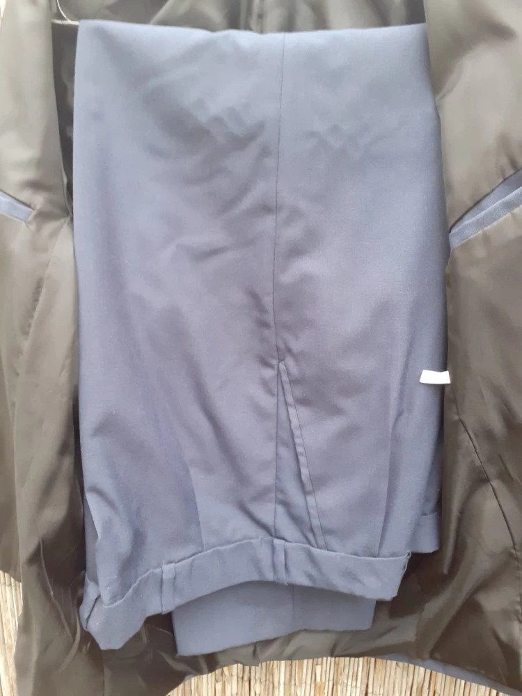 Atat vestonul, cat si pantalonii sunt culoare albastru deschis (in poze par mai mult spre gri, din cauza camerei foto). Marimea pantalonilor este 50 II, marimea vestonului nu este scrisa pe el.