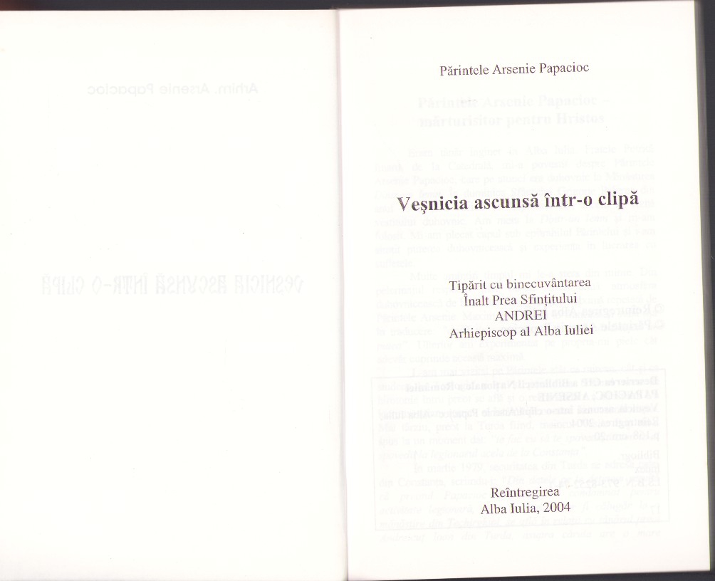 Veșnicia ascunsă într-o clipă de părintele Arsenie Papacioc, carte tipărită cu binecuvântarea Înalt Prea Sfințitului Andrei, Arhiepiscop al Alba Iuliei, 2004.