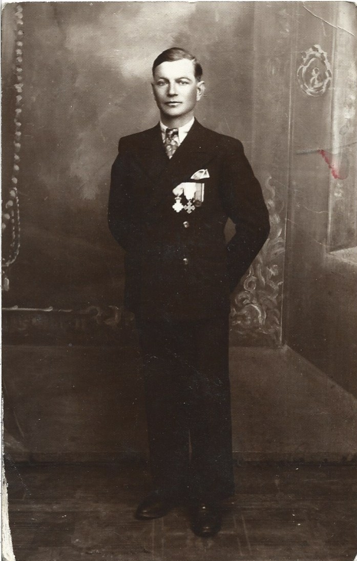 Veteran român din Primul Război Mondial purtând medaliile Serviciul Credincios, Crucea comemorativă a războiului 1916-1918 și panglica Bărbăție și Credință, studio N Stănescu, București.