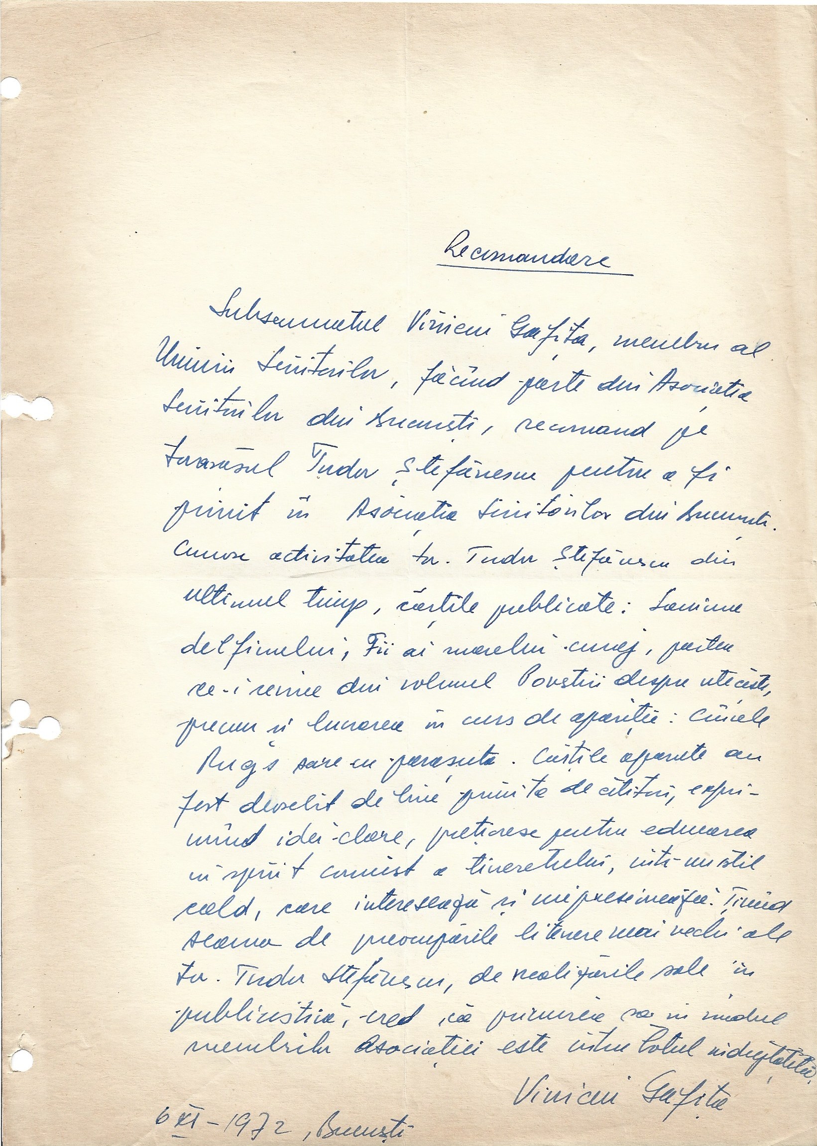 Viniciu Gafița, act scris și semnat olograf, 1972.