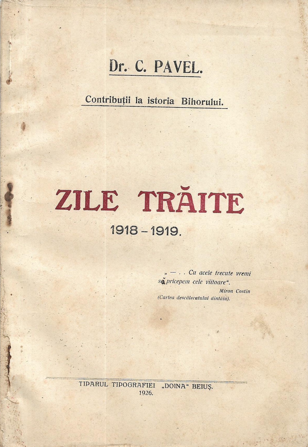 Zile trăite 1918 – 1919 de Constantin Pavel, 1926, Tipografia Doina, Beiuș.